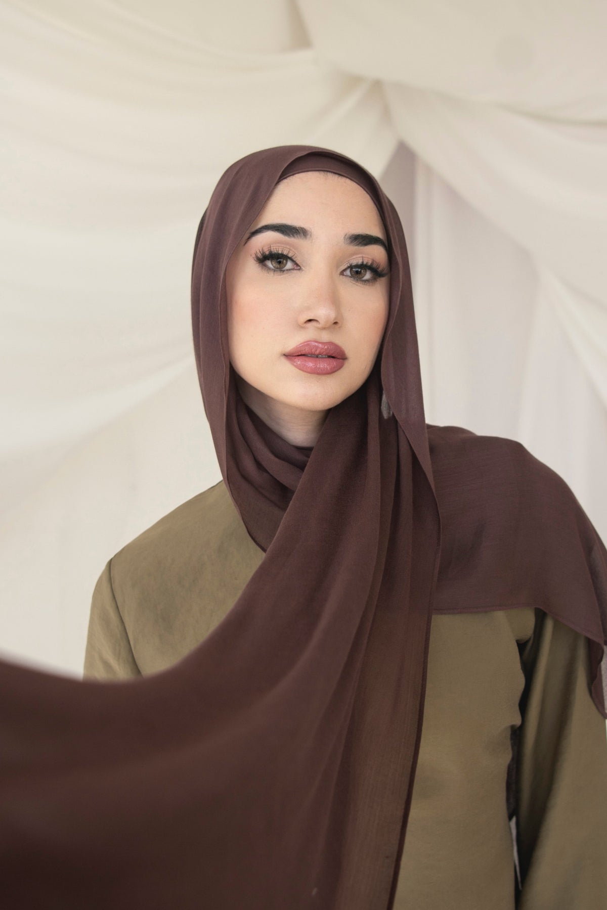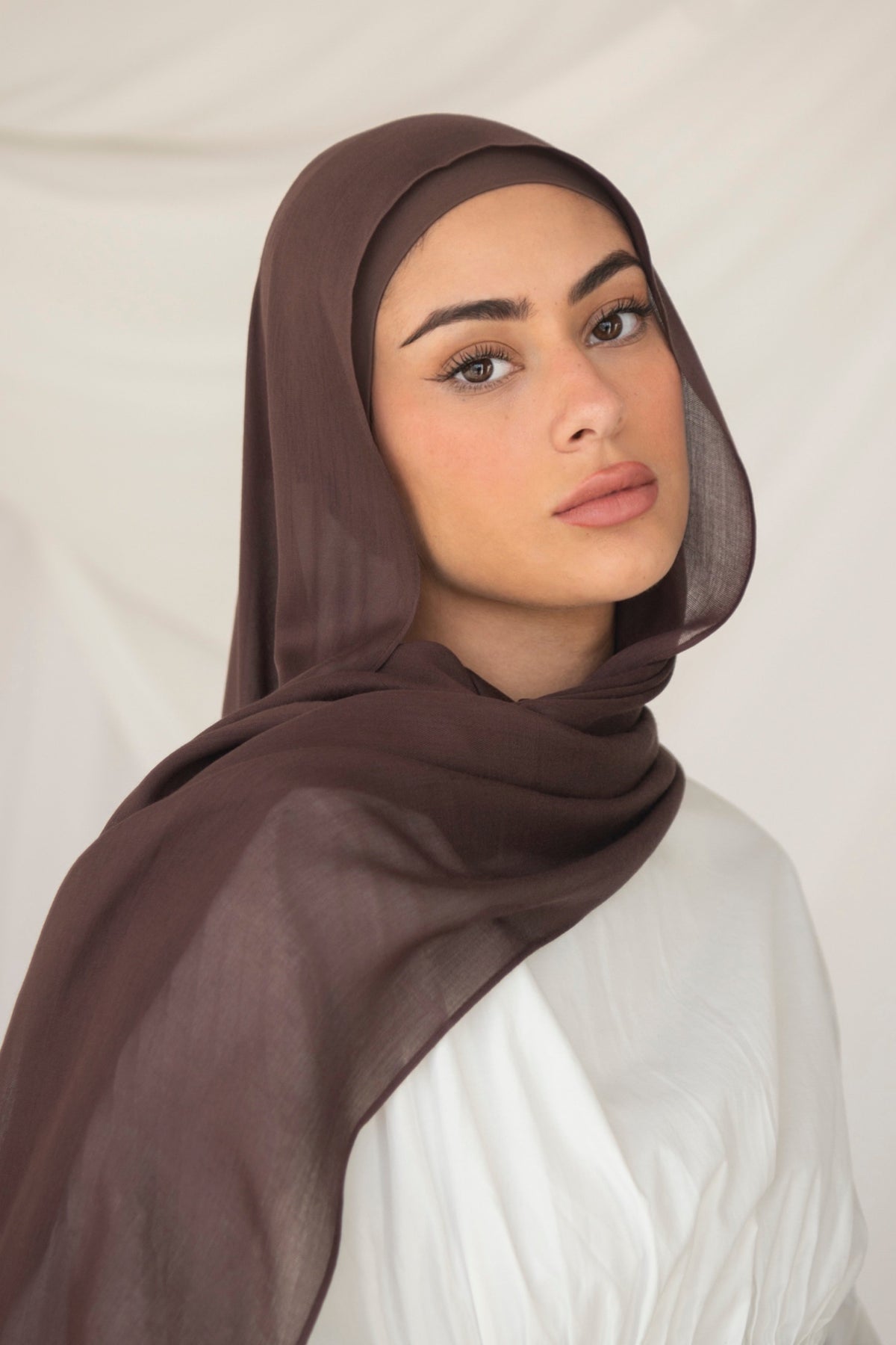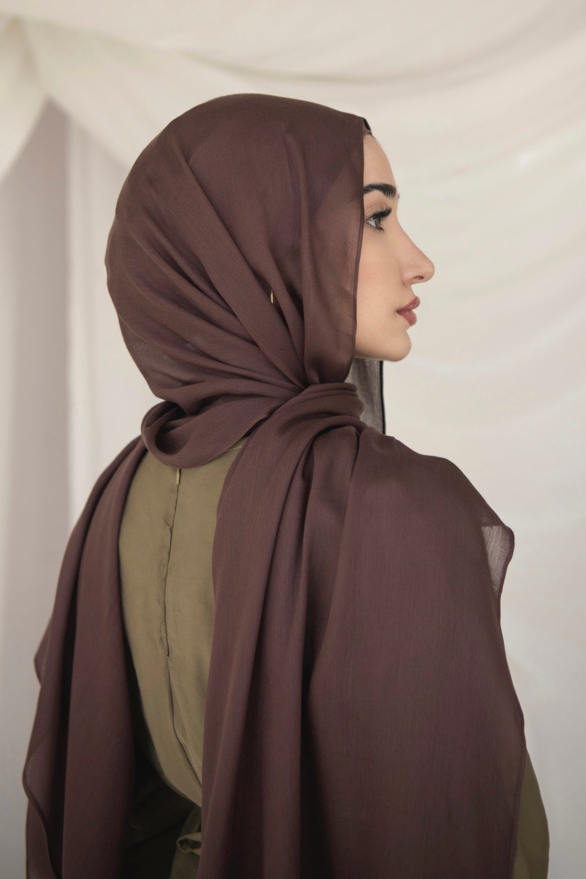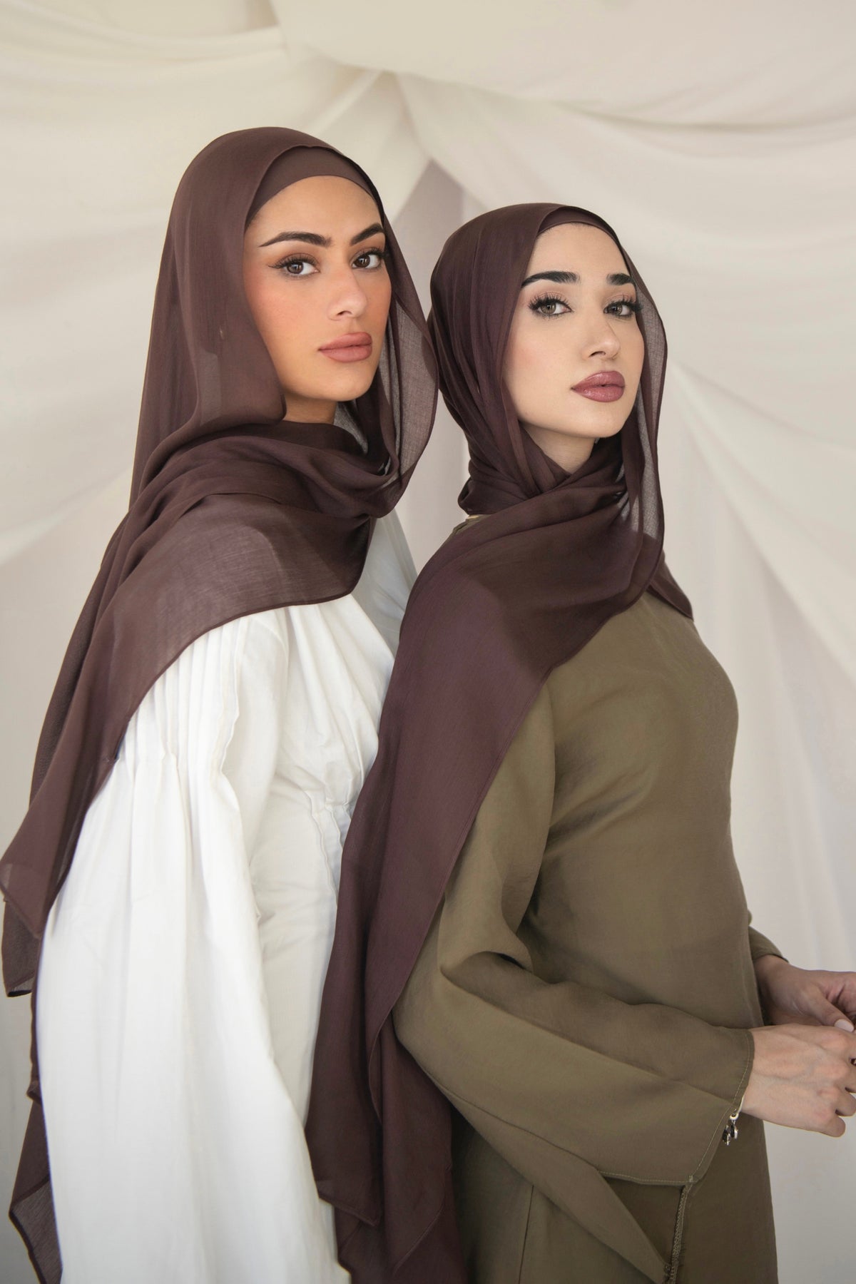 Introducing our buttery feel, light weight modal hijab in chocolate brown shade a rich, warm shade Inspired by the deep tones of melted cocoa, this hijab adds depth and sophistication to any look, essential color that every girl need to add to her hijabs collection.