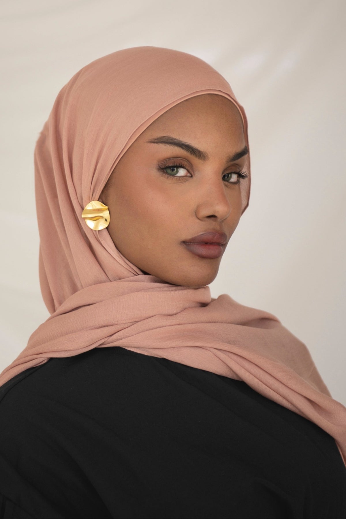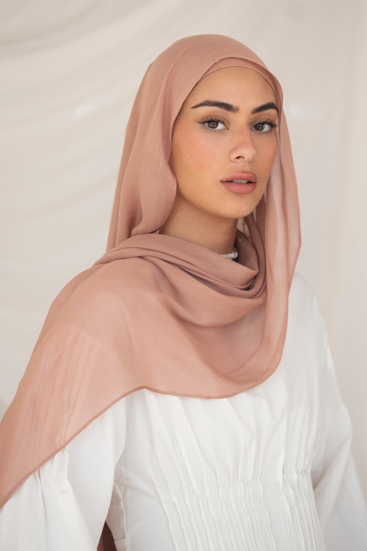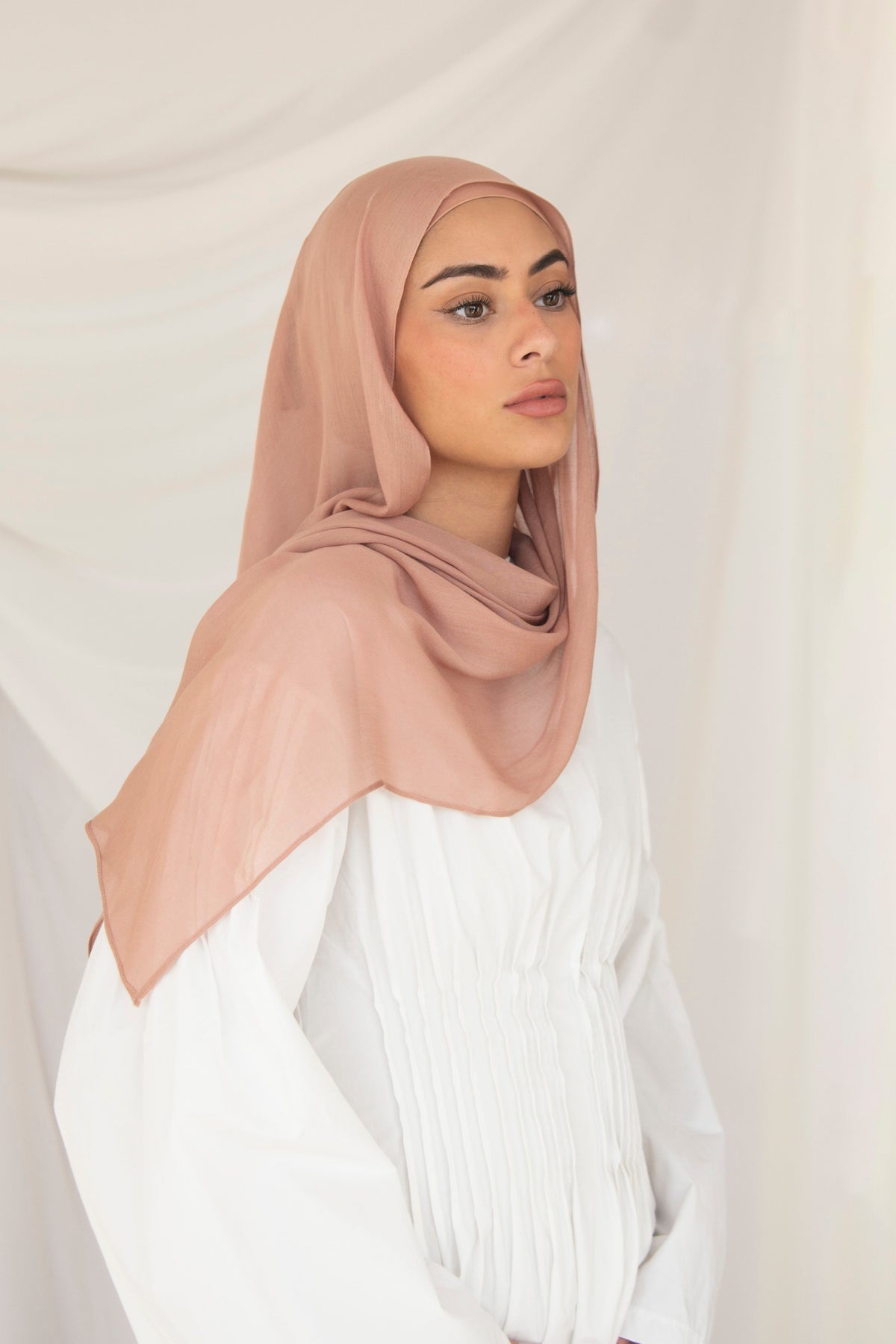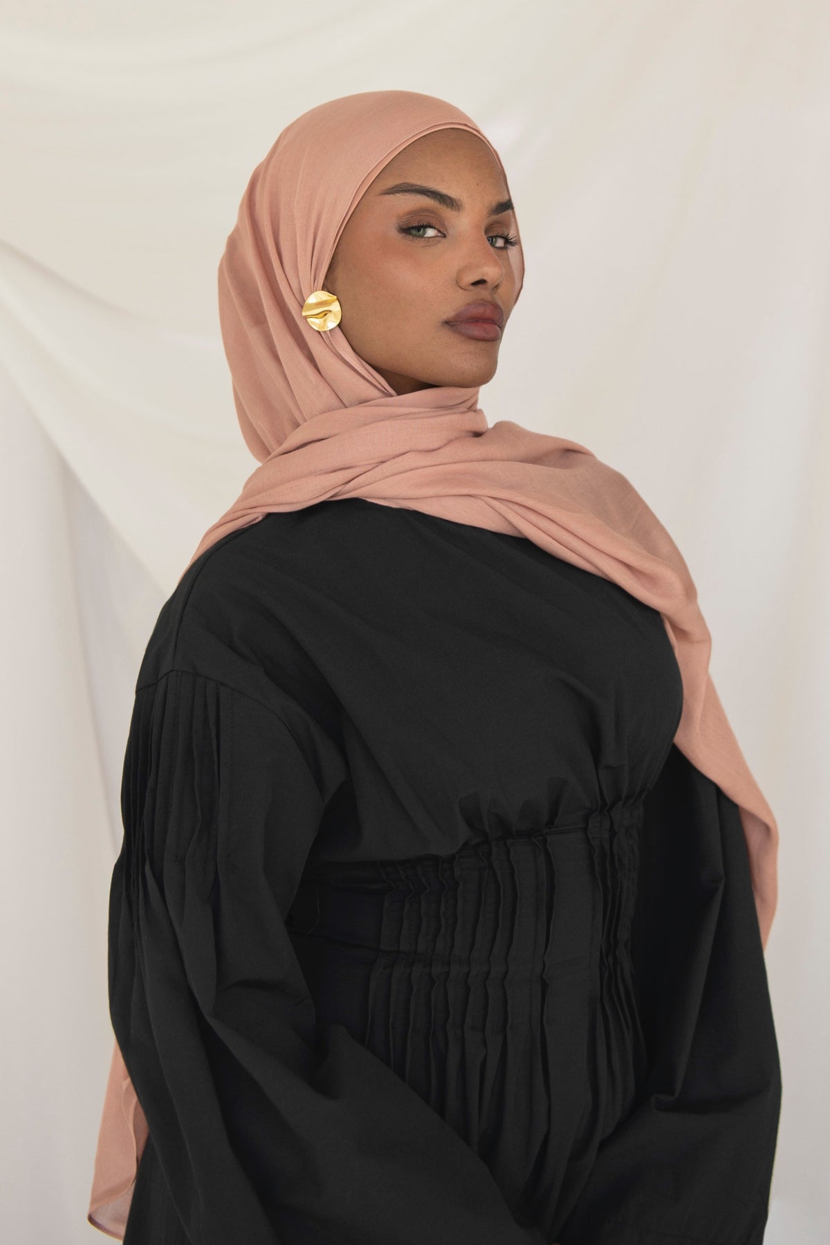 Introducing our buttery feel, light weight modal hijab in blushy peach shade a blend of peach and blush tones that captures the warmth of a sunset and the elegance of minimal femininity.